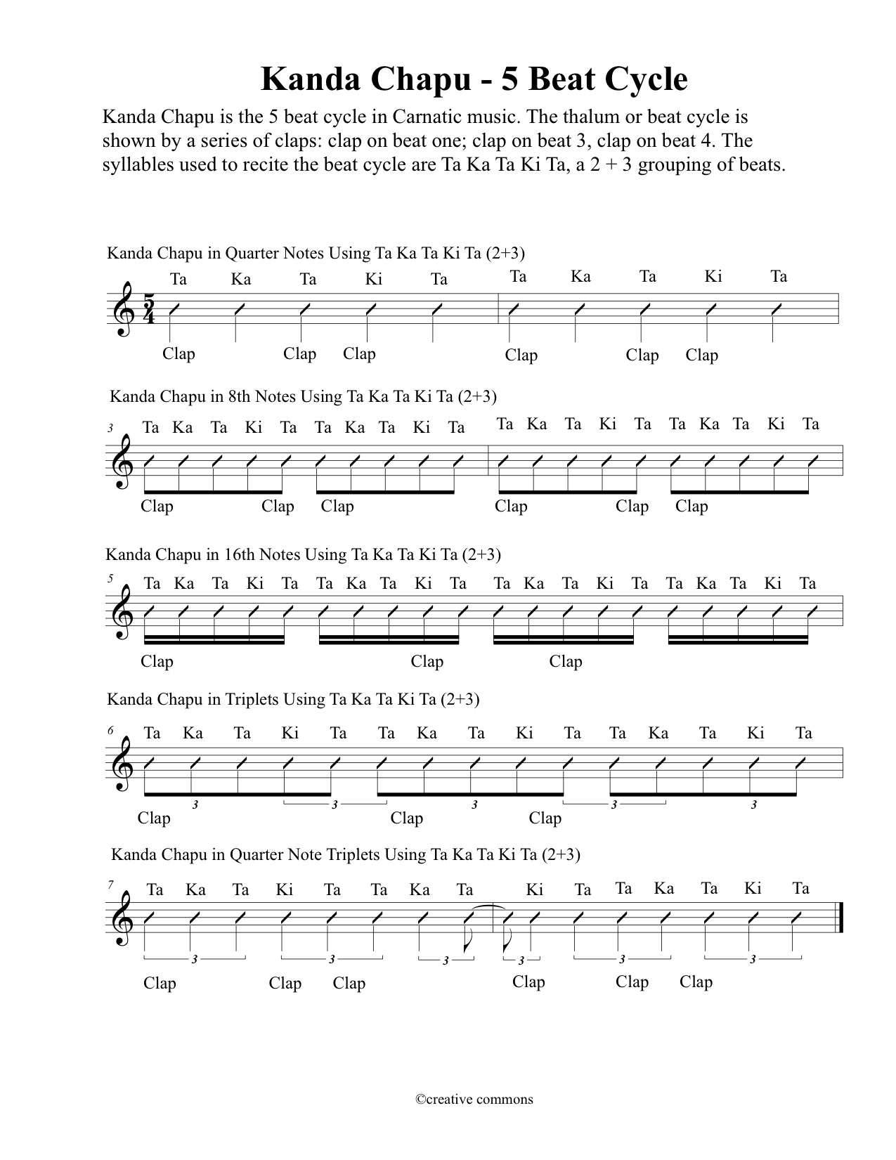 This is a written supplement to the audio lesson on Kanda Chapu, which can be found here. Kanda Chapu is the 5 beat cycle in Carnatic music. It can be thought of as 5/4 time. Start with the audio lesson first before checking out this notated content. You can download this lesson at the bottom of the page.