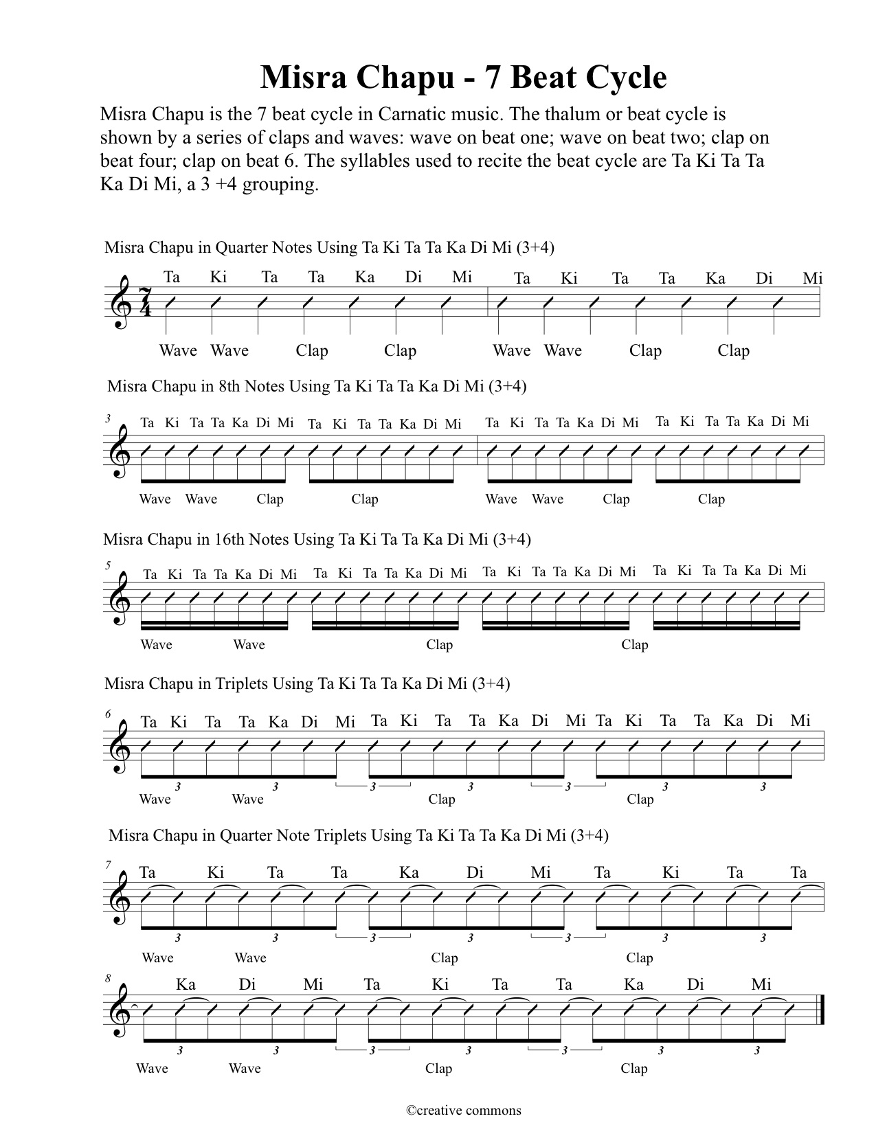 This is a written supplement to the audio lesson on Misra Chapu, which can be found here. Misra Chapu is the 7 beat cycle in Carnatic music. It can be thought of as 7/4 time. Start with the audio lesson first before checking out this notated content. You can download this lesson at the bottom of the page.