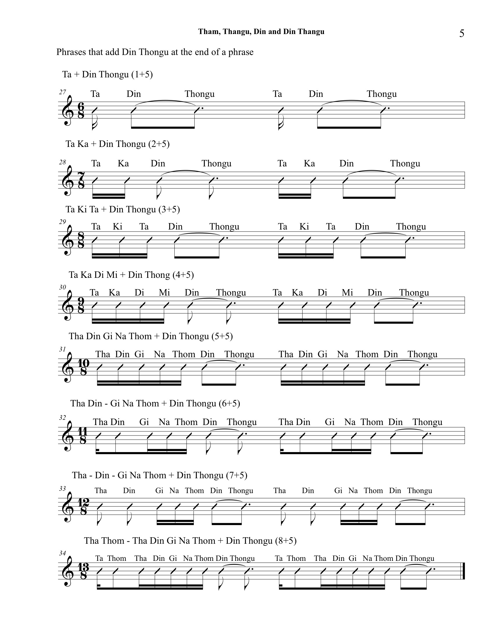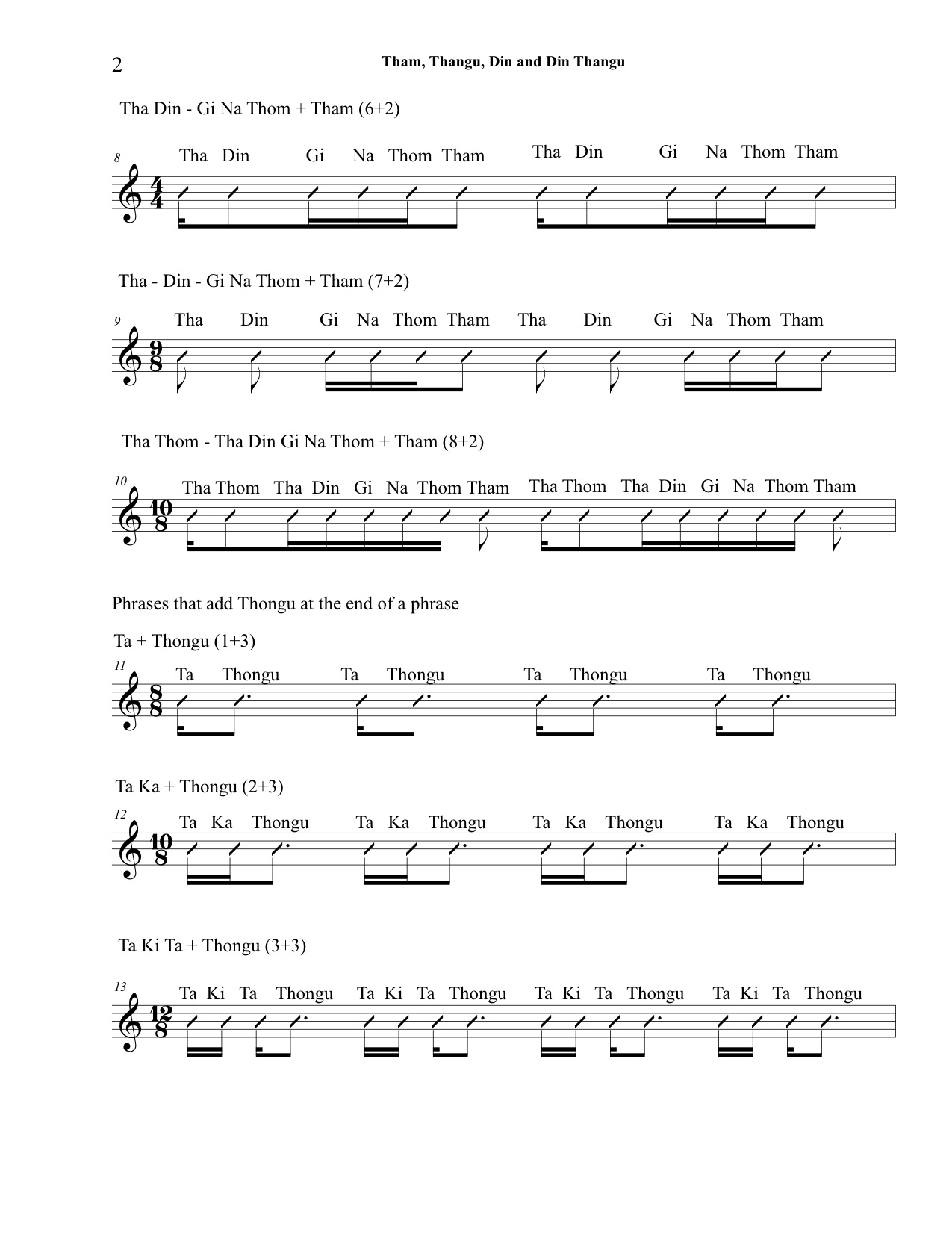 This lesson introduces the very important concept of gaps or spaces in the konnakol language. Tham, Thongu, Din and Din Thongu can be added to the end of phrases to augment ideas and increase rhythmic tension. Familiarity with these phrases will also make learning advanced phrases found in Korvais simpler. Ultimately a handle on these gaps allows long chains of rhythmic ideas to flow, breath and achieve a higher sense of musicality. Audio and video elements will supplement this content and be uploaded shortly. A downloadable pdf of this lessons is available at the bottom of the page.